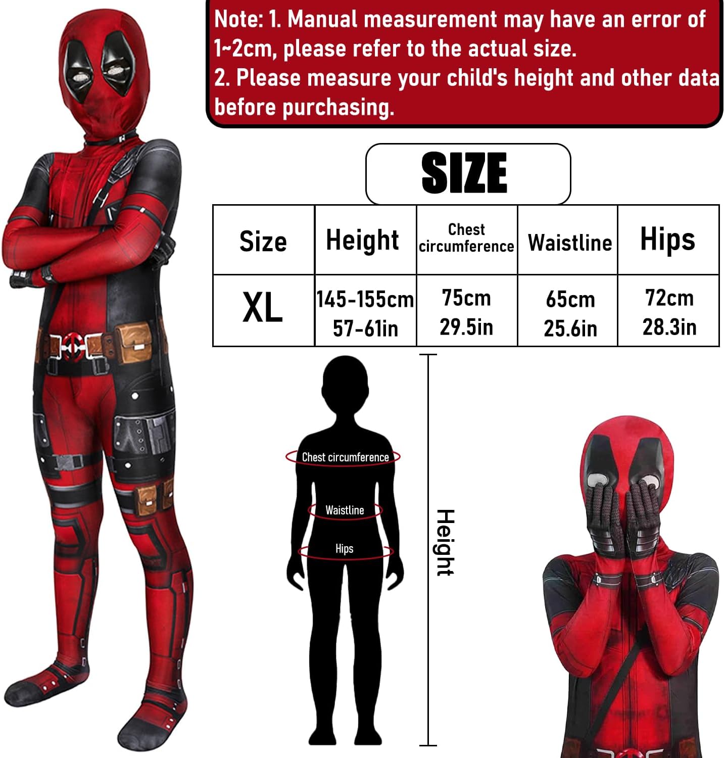 🕸️【Matériau extensible】Les Costume Super Héros Enfant sont fabriqués dans un tissu hautement extensible, facile à mettre et à enlever, et hautement respirant, ce qui le rend facile et confortable à porter. Vos enfants peuvent jouer confortablement à une fête toute la journée ! 🕸️【Design Unique】Deguisement Deadpoo Super Héros avec écran facial amovible. La combinaison a une fermeture éclair dissimulée à l’avant et à l’arrière. Facile à mettre et à enlever, même lorsque vous êtes seul, vous pouvez facilement enlever ce vêtement. 🕸️【Informations sur la taille du costume】La gamme de tailles du costume Deadpoo pour enfants est de 145-155 cm. Les enfants peuvent se considérer comme leurs héros préférés en costume Deadpoo jumpsuit. Contenu: 1 * Deguisement enfant Deadpoo, 1 * Deadpoo masque. 🕸️【Cadeau idéal parfait】Le costume Deadpoo de super-héros est le cadeau parfait pour les fans d’anime. Si votre enfant est un fan de super-héros, vous devez absolument lui acheter un costume de super-héros. 🕸️【Largement Utilisé】3D Anime Déguisement Deadpoo sont parfaits pour Halloween, carnaval, le cosplay, les événements à thème, les soirées animées, les spectacles scolaires, les fêtes costumées pour enfants, etc. Si vous recherchez costume cosplay, vous allez adorer notre costume Deadpoo enfant.